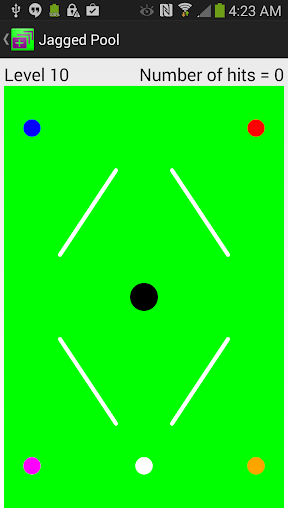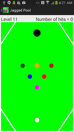 This game (Jagged Pool) is based on a modification of the regular pool game. The goal is to make the colored balls go into the black hole (i.e. pocket them) by hitting them with the white ball with the fewest number of hits. The white ball should not be pocketed, otherwise the level will be restarted. Unlike the regular pool game, here you can hit before the balls stop moving. So, hit them on the fly for the best results! Touch and drag the white ball to aim. The farther you drag it, the faster it will move. You can also adjust its speed using the slider at the bottom.