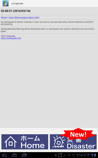 - When an earthquake over seismic intensity 5 occurs in Japan, the app. will notify users in the language of their choice.