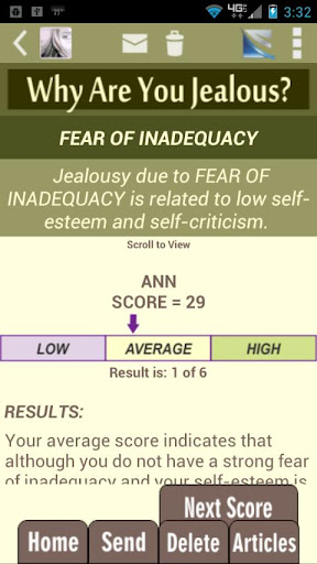 Evaluates the reasons WHY you have jealousy if you have already shown that you have a problem. However, does not determine IF you have a problem. Provides information about fears that cause irrational jealousy: Fear of Inadequacy, Fear of Feeling Bad, Fear of Loss of Ego, Fear of Loss, Fear of Being Hurt, & Fear of Vulnerability.
