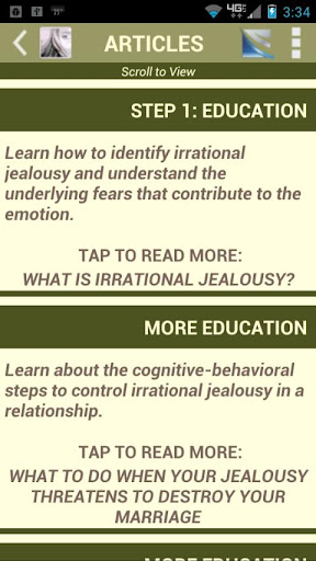 If you answered "yes" to any of these questions, this app uses the methods of cognitive-behavioral therapy (CBT) to teach you how to address the irrational jealousy that interferes with your relationship.