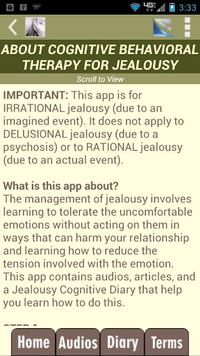 IMPORTANT: This app is for IRRATIONAL jealousy (due to an imagined event). It does not apply to DELUSIONAL jealousy (due to a psychosis) or to RATIONAL jealousy (due to an actual event.