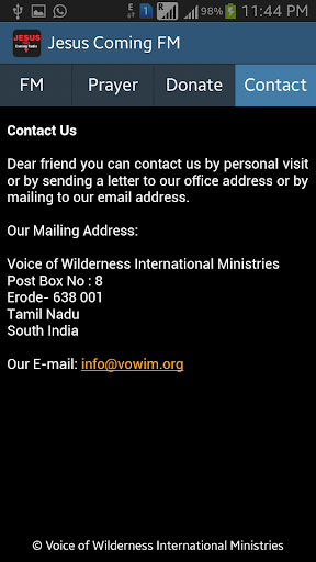 This application has Jesus Coming FM internet radios a online ministry through Voice of Wilderness International Ministries. You can listen live broadcast anytime, anywhere with all types of connections WiFi, Mobile Data.