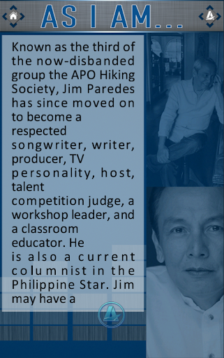 This is the official app of Jaime Ramon "Jim" Paredes a Filipino musician, producer, educator, writer, photographer, television personality, workshop facilitator, and activist best known for being one-third of the APO Hiking Society.
