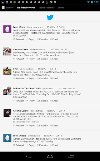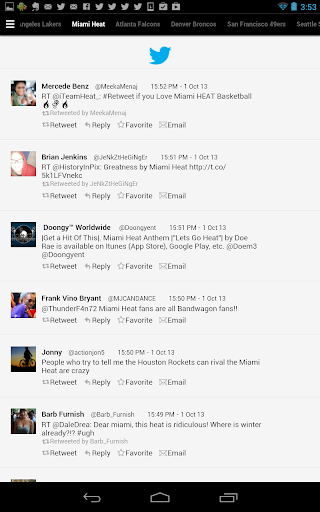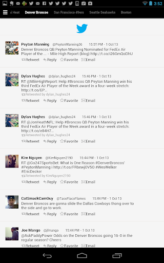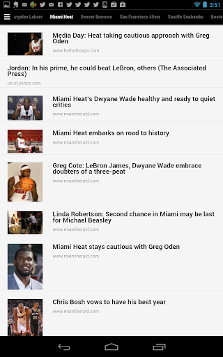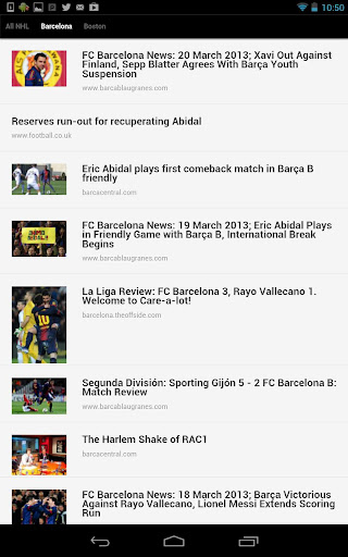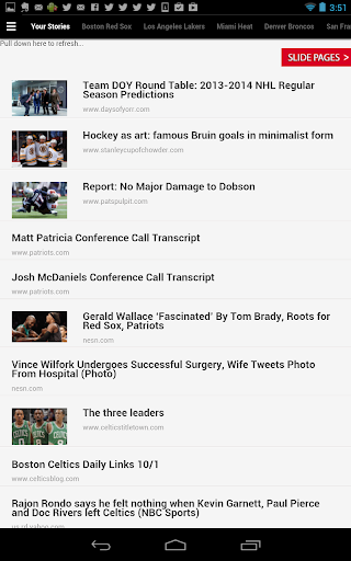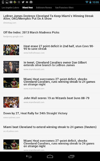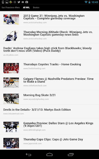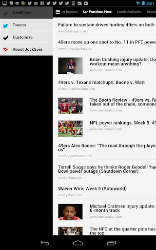 Jockspin for Android fetches sports headlines and tweets from thousands of sources, then delivers them based on your preferences. Simply select from over 300 teams, sports, leagues, and regions - no registration is required. Pages of recent headlines and tweets are generated in for each, navigable by sliding pages from side to side. Switch between headlines and tweets via the menu icon, where you'll also find the option to quickly modify your selections.