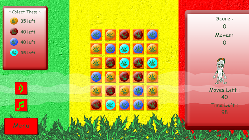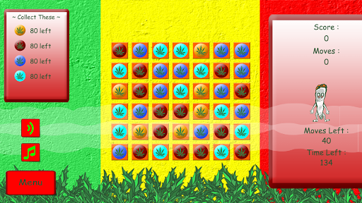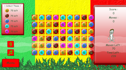 Your task is to fit 3 or more bubbles with same color in one row. If you do so you will knock them down. 4 weed jewel in row will generate special marijuana gem which destroy surrounding gems. 5 bubbles in row will give you ultra specjal gem. You can destroy all weed jewels with color of your choice.