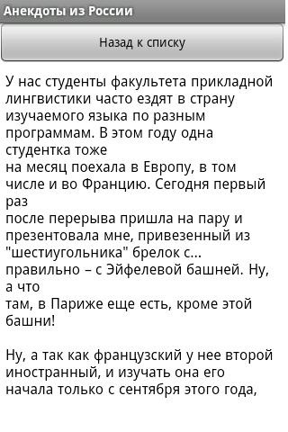 This application delivers jokes (anekdoti), funny stories, aphorisms, funny poems from Russia using RSS feeds of www.anekdot.ru. Content is not edited and might contain some Russian slang. Content is updated every day! It has enough to entertain yourself for about 30 minutes.