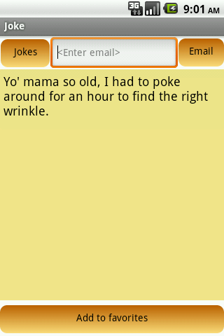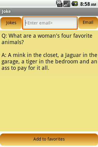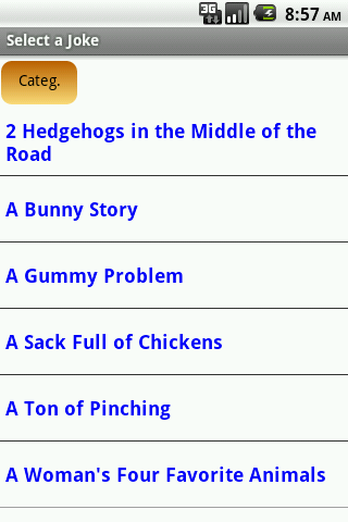 More than 12000 (YES! TWELVE THOUSAND) categorized jokes of many types including the following categories: Technology, That Is Gross, Dirty Jokes, Nationality, Dark Humor, Little Johnny, Marriage, Lookin' Good, Money, Insults, Lawyers, Police & Military, Work, Jokes about Kids, Doctor,