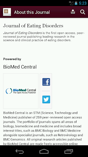 Tap into the most recent developments in eating disorders research with the Journal of Eating Disorders app. The Journal of Eating Disorders is a peer-reviewed open access medical journal published by BioMed Central. The Journal continuously publishes review articles, original papers, and educational articles that cover all aspects of eating disorder research.