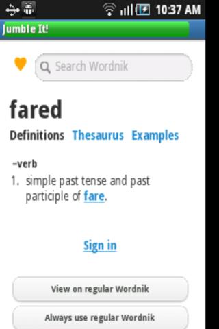 Jumble It! for Android is a Word Game where you have to assemble a valid word from a set of jumbled characters. The game supports over 15,000+ words. You can elect to play with 4-letter, 5-letter, 6-letter or even a random word from any of the sets.