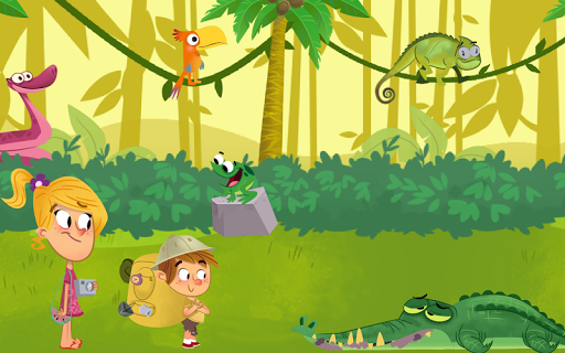 In the Jungle educational game you will count the hidden monkeys, help panda to choose the bucket with right color, catch and count the hidden parrots, help Froggy to cross the swamp, play catch with two snakes, brush Croco's teeth, help Leo to make a soup, collect coconuts with Mister Crab, connect the dots and learn to recognize the names of common shapes (such as a square, rectangle, triangle, circle and oval), find and count the hidden chameleons.