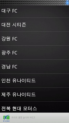 Busan I'Park, Chunnam Dragons, Daegu FC, Daejeon Citizen, FC Seoul, Gangwon FC, Gyeongnam FC, Incheon Utd, Jeju Utd, Jeonbuk Hyundai Motors, Pohang Steelers, Seongnam Ilhwa, Suwon Samsung Bluewings, Ulsan Hyundai Tigers