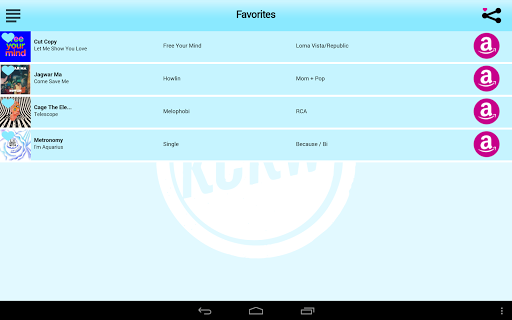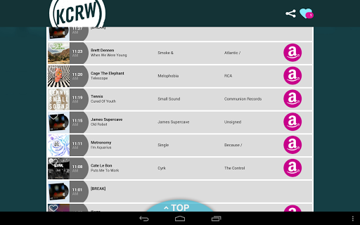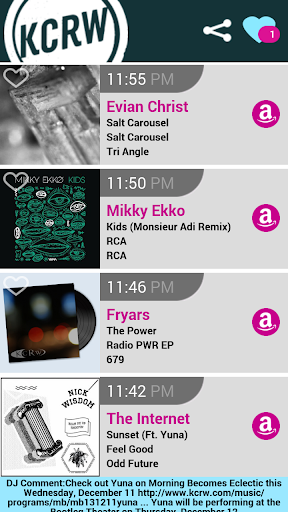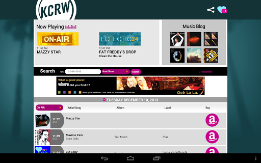 Heard a song during your favorite KCRW music programming, but couldn't figure out the artist? The KCRW Playlists app tells you what music is hitting our airwaves at any given moment. Browse by music channel (including On Air Programming or Eclectic 24), specific date, radio host, artist, or song title! Playlists are broken out by date and time, making it easier than ever to find the song you're looking for.