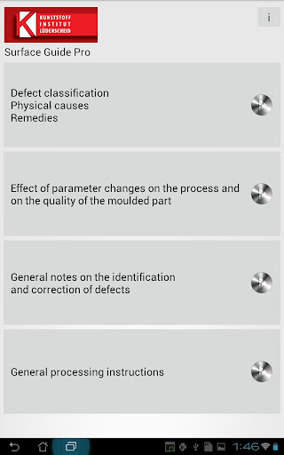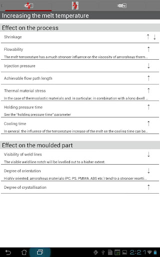 Quickly and easily identify surface defects with the KIMW Surface Guide. The comprehensive image database is always at hand and helps you with error identification.KIMW Surface Guide describes both the physical causes and the process-related remedies. Your mobile guide contains important information for reducing and avoiding errors. The effects of parameter changes in the process and on part quality are clearly shown. Important hints for troubleshooting and general processing instructions are available simply at the touch of a button. Try the free version KIMW Surface Guide Lite or use the full functionality of KIMW Surface Guide Pro.