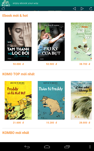 KOMO Reader là ứng dụng để bạn có thể đọc sách điện tử từ kho sách phong phú của KOMO (http://www.komo.vn). Komo Reader mang đến cho bạn trải nghiệm đọc sách điện tử thú vị với nhiều tính năng tiên tiến trong một giao diện thân thiện với người đọc. Bạn đọc có thể đánh dấu trang, ghi chú đoạn văn bản, tô sáng đoạn văn bản, thay đỗi font chữ, thay đổi màu nền.