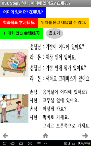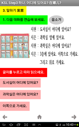 3. 내용 : KSL생생한국어공부step3는 '어디에 있어요.', '책을 읽으세요.'를 주제로 대화를 통한 듣기, 말하기, 읽기, 쓰기 학습을 합니다.