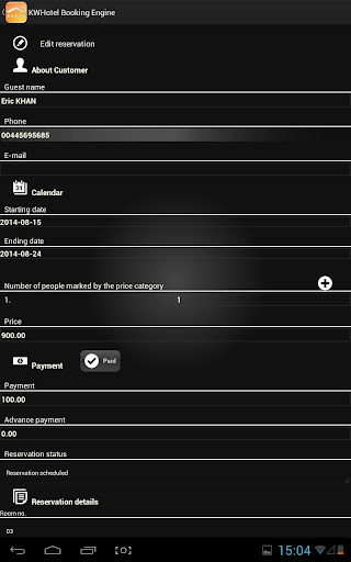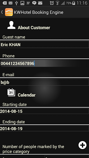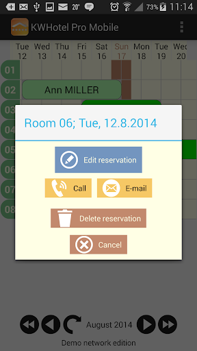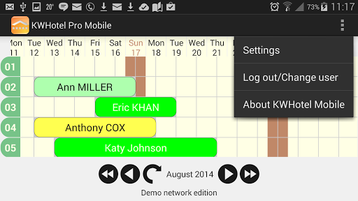 KWHotel Pro Mobile is a demo version, performing on an exemplary database of the KajWare company, thus the booking calendar is the same for all users. In order to gain access to the full version, please contact us through support@kwhotel.com.