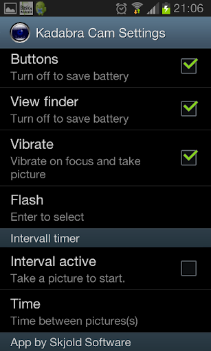 -Many settings, Front/back camera, shutter sound on/off, view finder on/off, buttons on/off, vibrate on/off, flash on/off,