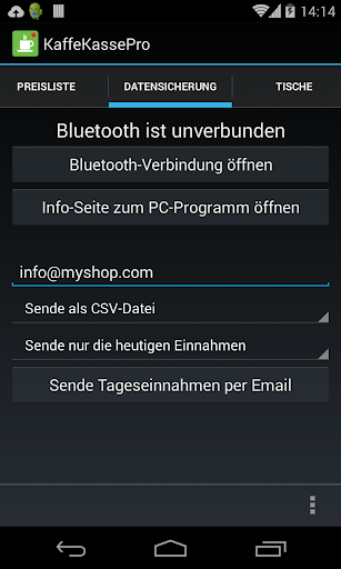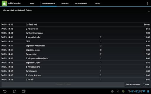 Alle Verkäufe werden übersichtlich entweder nach Datum, nach Anzahl oder nach Tischen angezeigt. Die Liste der Tageseinnahmen kann als Text- oder CSV-Datei mit E-Mail verschickt oder direkt via Bluetooth auf einen PC übertragen werden. Für die Bluetooth-Übertragung ist ein separates Programm erforderlich, was kostenlos zum Download auf der Seite des Anbieters angeboten wird (siehe unten für den Link „Webseite des Anbieters“).