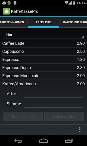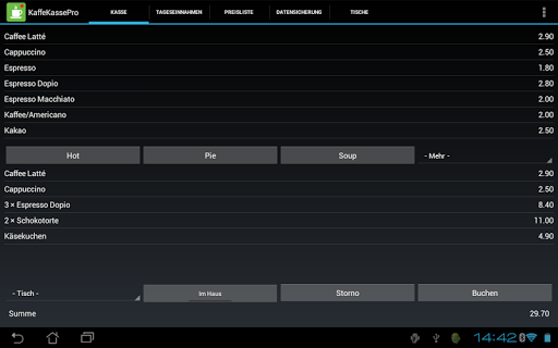 KaffeeKassePro ist eine App für kleine Cafés, Cafeteria und Verkaufsstände und alle, die mobil Verkäufe protokollieren wollen. Die App verbucht alle Verkäufe in einer internen Datenbank und erstellt eine übersichtliche Liste der Tageseinnahmen.