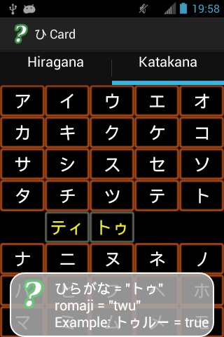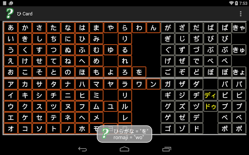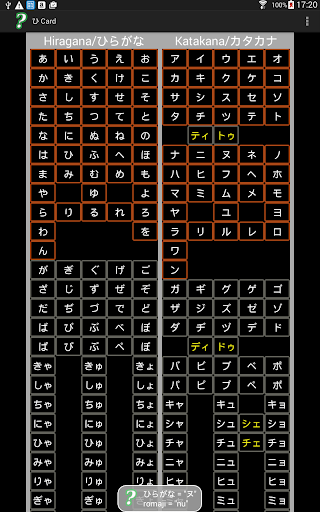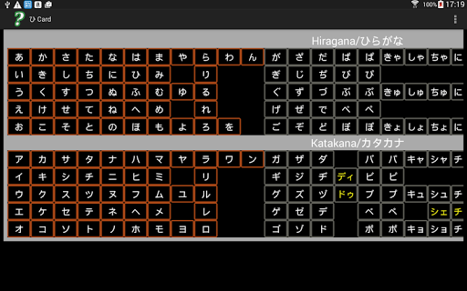 This is a Hiragana/Katakana card with sounds. It consists of two pages: one for katakana and one for hiragana. Clicking on a character plays the sound associated with the character and shows the romaji used by the Japanese Language IME (Input Method Editor) for keyboard input of Japanese characters. It includes most of the special Katakana characters (特殊音/tokushuon) used for pronunciation of loanwords.