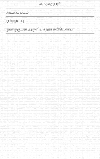 Kumaraguruparar was born to Shanmukha Sikhamani Kavirayar and Sivagama Sundari Ammaiyar in Srivaikuntam, Tirunelveli district. Until age five, he was dumb. When they visited Tiruchendur temple, he was blessed with speech. Deeper and deeper they went from knee to neck and, as they were about to sink with the waves over their heads a human form appeared with a flower in his hand and asked the child what it was; all in a surprise the child broke out in praise of the Lord with the words; "Poomevu senggamalap..." the opening lines of Kandar Kalivenba. This delightful poem of 244 lines projecting the praise of God and the truths of Saiva Siddhanta.