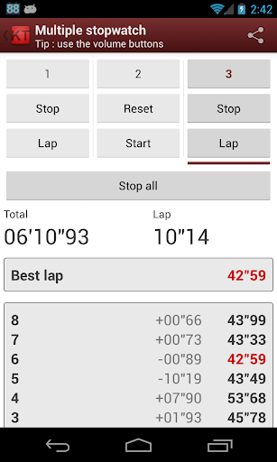 - advanced stopwatch : up to 3 drivers simultaneously, volume buttons trigger, laps history with lap difference, chart, consistency, share excel export by email, Facebook, ...
