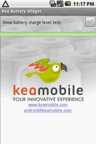 Battery Widget with enhanced UI and good precision of measurement. You will be able to configure whether to display the percentage or not. We hope you like it; do not hesitate to send comments to android@keamobile.com