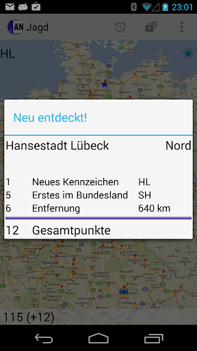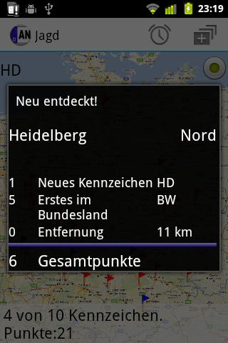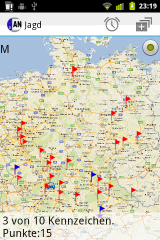 Jede Stadt, deren Kennzeichen Du entdeckt hast, gibt Dir ein rotes Fähnchen auf der Deutschlandkarte. Bist Du in einem Zeit- oder Punktespiel, siehst Du die Städte, die Du im Spiel gefunden hast, als blaues Fähnchen. Du siehst auch immer Deinen aktuellen Standort.
