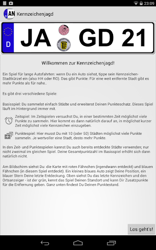 * Zeitspiel: spiele fünf, zehn oder dreißig Minuten lang. Sammle in der Zeit möglichst viele Autokennzeichen, um einen Eintrag in der Highscore-Tabelle zu erlangen. Hier geht es darum, möglichst viele Autokennzeichen zu sehen und einzutippen.