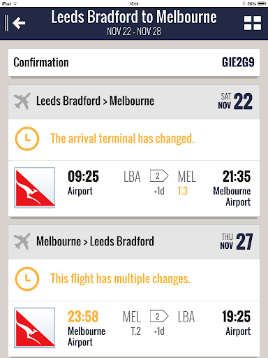 • Receive travel alerts for situation changes which may affect your journey e.g. flight delays or gate changes