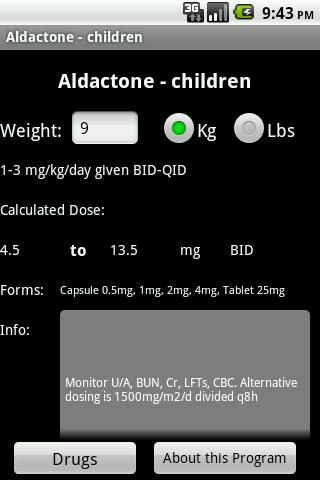 An essential Tool for Pediatrics. NOW WITH with Rapid SEARCH functionality. Rapid retrieval, dosage calculation, and dosage range checking of most commonly used pediatric medications. This was the most Popular Pediatric dosage application for the Palm OS now finally available for the Android AND iPhone! The full version contains complete database and calculates Pediatric doses for weights in both pounds and kilograms.