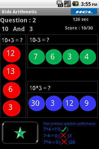 This game provides practice on basic arithmetic (Addition, Subtraction and Multiplication) for I and II grade kids, in a simple test format with scores.