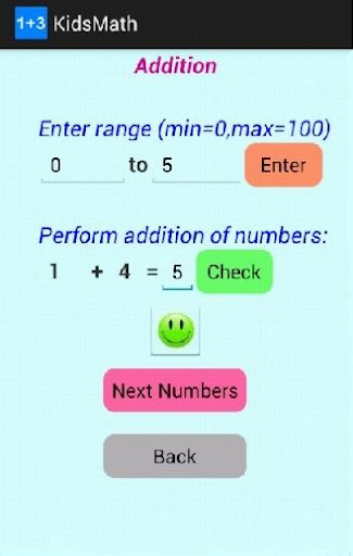 KidsMath is an app for kindergarten kids to learn & practice mathematics in fun way. This app includes addition, subtraction, multiplication & divide operators performed on equations with two numbers. This app also include range specified by user that allows kids to learn & practice numbers with different ranges. The numbers in equations are randomly picked from the range as specified. Currently the app has only addition operator enabled and plan is to enable the rest in subsequent releases.