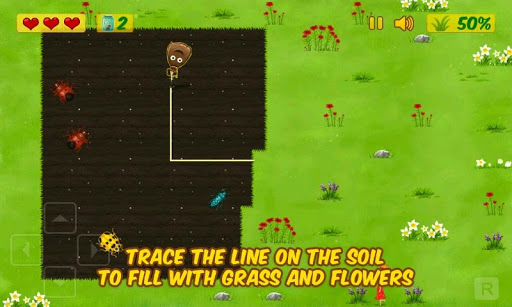 Help little girl Lily to change empty ground into a beautiful place with grass and colorful flowers. Use a Bag with Seeds to trace the line on the ground from one side to another and fill it with grass and beautiful flowers.