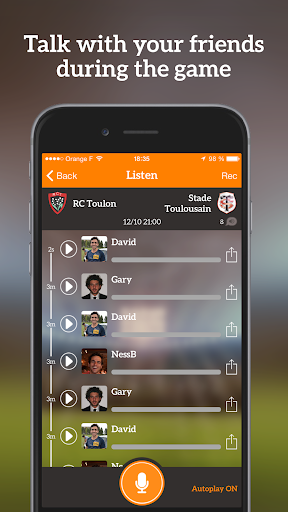 Live broadcasted, your audio messages (up to 15 seconds) can be listened by everybody. By recording your voice, you participate to the coverage of your favorite game, along with other fellow sportscaster on Kikast. The audience follow a game by listening live to all your commentaries.
