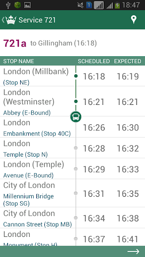 The app includes a Service page that displays the entire route by listing all stops with their scheduled and expected arrival times as well as a toggle to map to view the route with the vehicle and stop locations.