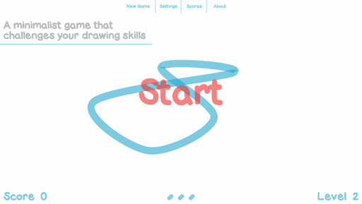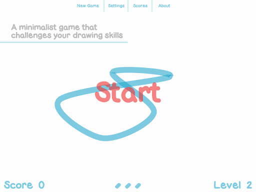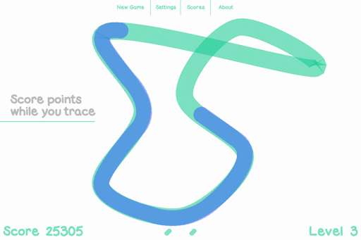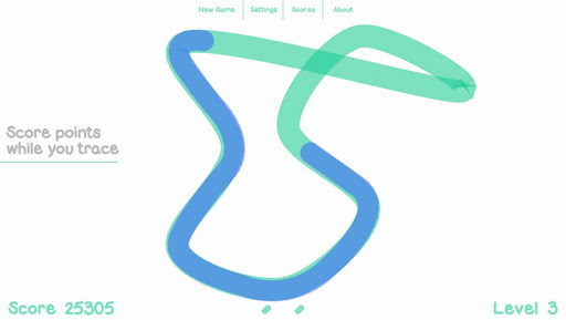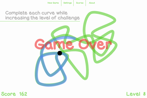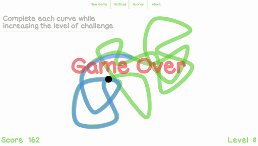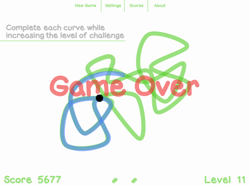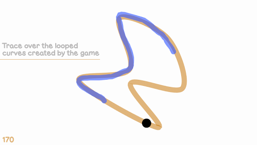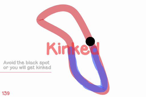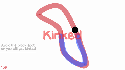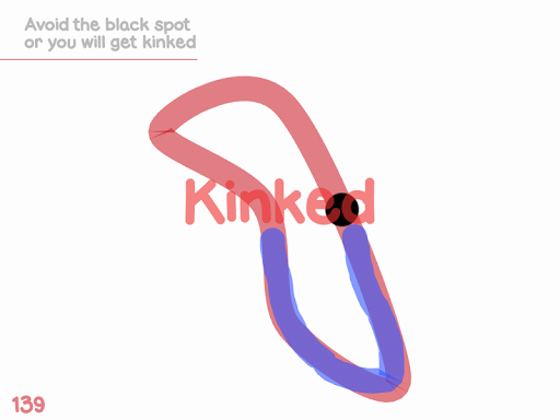Kink generates random looped curves for you to trace over. You can start tracing from any portion of the curve. A black spot appears at the opposite portion and starts to follow the curve in the same direction you took. Avoid touching this dot or you will get kinked. If traced correctly a new curve is created with an increased level of difficulty.