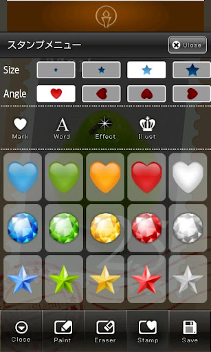 Kirakira Photo Studio has 100 different kinds:20 frames and 80 stamps that decorates your photo. Just take a photo using your favorite frame, then decorate it with stamps and different pen tools. There are two categories under the frames and four categories under stamps, pick whichever one you like according to the scene.