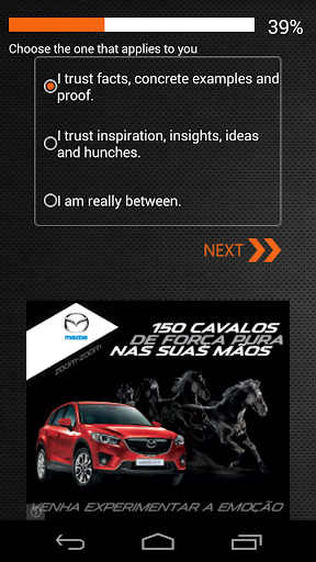 This test will firstly evaluate your extrovertness or introvertness level. Then it will analyse if you are a more sensing or intuitive person. As a 3rd step it will tell how thinking or feeling you are. The last step will compare your judging and perceiving levels.