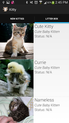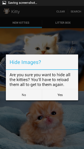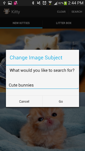 KittyApp is an image searching, viewing, and saving app that finds images of cute kittens (or anything else you wish to search for) and allows you to "adopt" the kittens. This app is meant to brighten up your day by providing cute pictures of kittens. In the future, more interaction with adopted kittens may be implemented if there is enough demand.