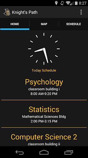 With this application, students at the University of Central Florida will be allowed to store their schedules and events for their own reference. Using Google Map's api, students will then be able to traverse from their classes and events every day of the week.