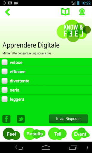 Know & Feel è l'applicazione che ti permette di approfondire i temi di Knowledge in un'ottica social, e contribuire alla costruzione della mappa delle impressioni suscitate dall'evento.