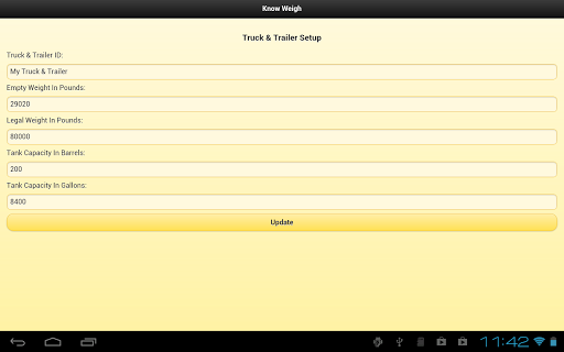 The Driver sets up the application by simply entering the empty weight of the tractor/trailer, the maximum legal weight, and tank capacity. The app remembers this info entered at initial setup.
