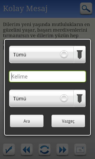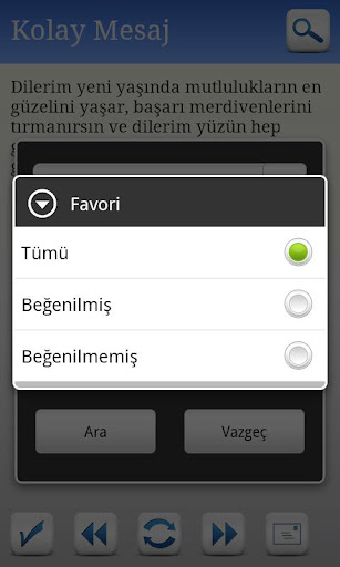 - Mesajlar arası parmakla geçiş özelliği mevcuttur. Ekrana çift tıkladığınızda seçtiğiniz kriterlere göre rasgele mesaj gelir, parmağınızı sağa kaydırdığınızda bir sonraki mesaj gelir, parmağınızı sola kaydırdığınızda bir önceki mesaj gelir, parmağınızı yukarı kaydırdığınızda mesajı beğenir, aşağı kaydırdığınızda ise mesajı beğenilerinizden çıkarırsınız. Dilerseniz bu işlemleri altta yer alan tuşlara basarak da yapabilirsiniz.