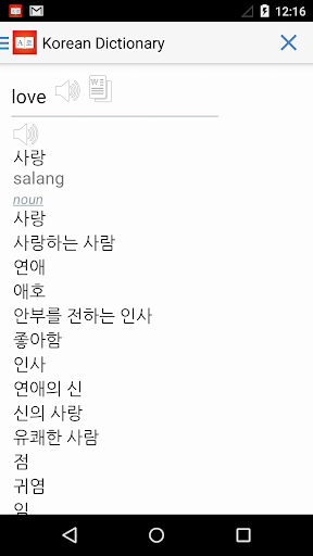 Bilingual dictionary translate words and phrases from English to Korean and vice versa. Over 94,000 English and 91,000 Korean words in an offline dictionary, with pronunciation. Includes word learning features and vocabulary training games.