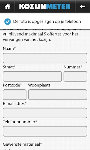 Wanneer je het kozijn hebt opgemeten kun je de foto met afmetingen opslaan en direct een offerte aanvragen! Zo makkelijk kan het zijn. Je aanvraag voor een offerte wordt verzonden naar erkende kozijnbedrijven en je ontvangt maximaal 5 offertes van verschillende aanbieders. Deze offertes zijn gratis en geheel vrijblijvend.
