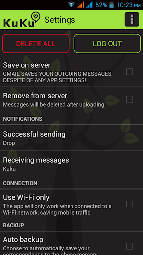 Install Kuku, and write what you want without fearing for your privacy, censorship, bans, wiretap intelligence services. Because your account, for example, will be in another country. In the settings you specify instant removal of all correspondence with the server.