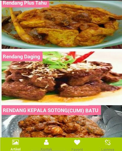 Bagi Anda yang menyukai Produk Olahan daging ,Aplikasi Aneka Rendang menyediakan berbagai macam resep olahan Rendang pilihan yang sempurna bagi anda yang baru belajar ataupun yang sudah bisa memasak .Aplikasi ini dilengkapi kreasi seperti spagetti bumbu rendang, Rendang Kepala Sotong(CUMI) Batu,dan aneka Rendang khas nusantara .aplikasi ini sangat berguna bagi anda yang ingin mengeksplorasi menu masakan Rendang diseluruh Indonesia