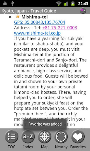 MobileReference Travel Guides provide detailed, practical information about attractions, landmarks, transportation, cultural venues, dining, lodging, history and much more. They are indexed alphabetically and by category, making it easier to access individual articles. Attractions can be viewed on an offline GPS map along with your current location so that you can easily find attractions near you as you explore the city.
