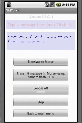 You can type up to 26 characters (A-Z and 0-9) that will be translated into Morse code on the screen, and then you can send this Morse code using your Camera flash LED.